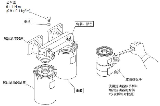 2.1 三菱S6R發(fā)動機燃油濾清器的解體,檢修,組裝( 紙質(zhì)濾芯)