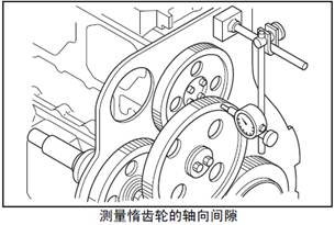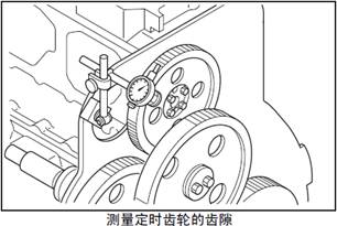 測量正時齒輪的齒隙,將千分表的表頭放置在齒輪節(jié)圓的圓周線上,與齒面垂直接觸,測量齒隙量,或在各齒輪的嚙合部分插入厚薄規(guī)進行測量。超過極限值時更換新的齒輪。