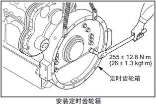 (3) 在正時齒輪箱上安裝吊具,對準定位銷后,安裝正時齒輪箱。