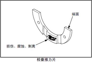 檢查三菱S12柴油發(fā)動機推力片的接觸面、背面和端面,如有接觸不良、滑動損傷、腐蝕、異物嵌入等異常時更換新品。