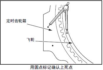 (3) No.1 氣缸上死點的確認方法是,在三菱R16柴油發動機飛輪端面和三菱R16柴油發動機正時齒輪箱上打刻有圓點標記,當3 點之間的距離相同的時候,既是No.1 氣缸的上死點。