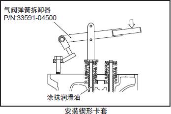 (5) 在氣閥導(dǎo)管上安裝彈簧座、三菱R16柴油發(fā)動(dòng)機(jī)氣閥彈簧、轉(zhuǎn)動(dòng)端蓋,用三菱R16柴油發(fā)動(dòng)機(jī)氣閥彈簧拆卸器安裝氣閥的鍥形卡套。