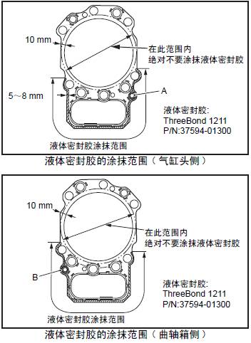 (2) 在氣缸墊片兩面的套筒孔和潤(rùn)滑油通路周圍薄薄涂抹液體密封膠。液體密封膠的涂抹范圍,在氣缸墊片外周的5 ~ 8 mm,厚度0.2 ~ 0.5 mm。詳細(xì)涂抹范圍參考右圖。