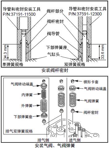 (d) 使用排氣雙三菱R16柴油發(fā)動(dòng)機(jī)氣閥彈簧時(shí),在安裝三菱R16柴油發(fā)動(dòng)機(jī)閥桿密封前先安裝下部彈簧座。