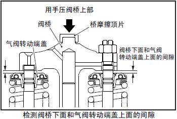 用手壓住閥橋,使閥桿上端面接觸,檢測(cè)閥橋下面和氣閥轉(zhuǎn)動(dòng)端蓋上面的間隙。間隙小于標(biāo)準(zhǔn)值時(shí),確認(rèn)故障的部件后更換新品。