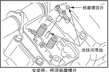 (3) 在橋頂部摩擦片和橋的接觸面涂抹潤(rùn)滑油,安裝頂部摩擦片。注意橋頂部摩擦片不要從頂桿孔落入三菱R16柴油發(fā)動(dòng)機(jī)三菱R16柴油發(fā)動(dòng)機(jī)缸體內(nèi)。
