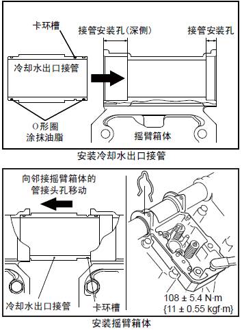 (6) 將冷卻水出口連接管朝對(duì)接的三菱R16柴油發(fā)動(dòng)機(jī)搖臂箱體移動(dòng)插入。