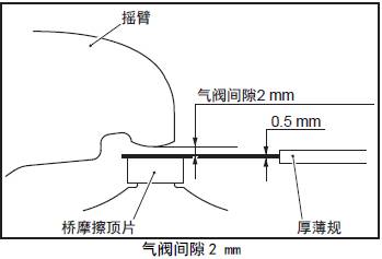 (1) 將0.5 mm 的厚薄規(guī)插入在橋頂部摩擦片和搖臂之間。( 氣閥間隙2 mm)