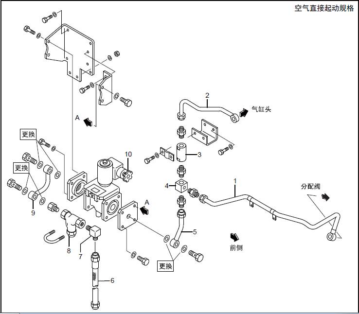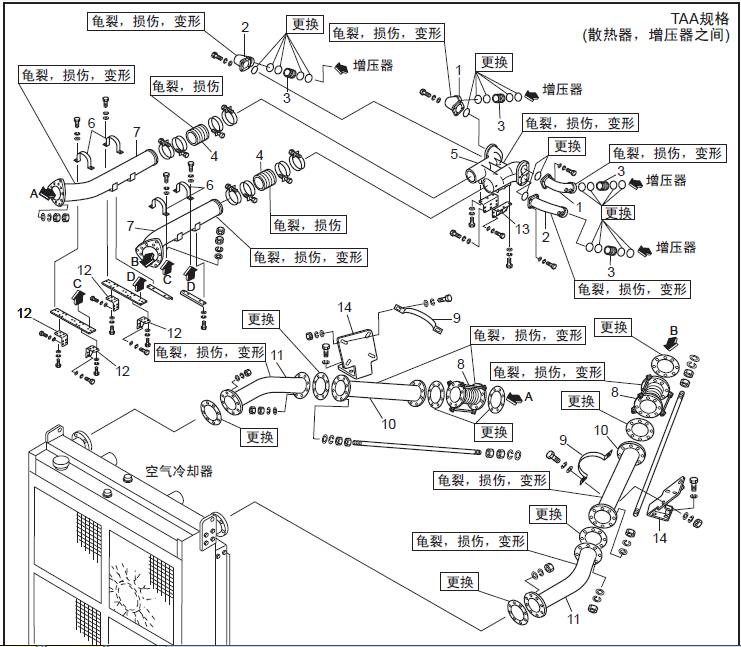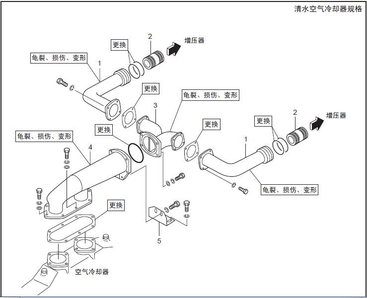 TAA規(guī)格(三菱S16柴油機(jī)空氣冷卻器、三菱R16柴油發(fā)動(dòng)機(jī)三菱R16柴油發(fā)動(dòng)機(jī)缸體之間) 空氣管的拆卸,檢修