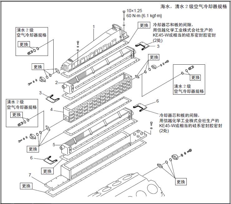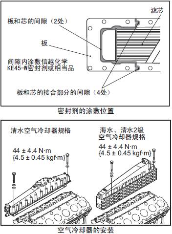 冷卻器芯和板之間的間隙,用信越化學(xué)工業(yè)株式會(huì)社生產(chǎn)的KE45-W 或相當(dāng)?shù)墓柘得芊饽z密封。