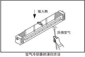 用壓縮空氣(0.29 ~ 0.49MPa{3 ~ 5 kgf/cm2} 以下) 沿通常的空氣流向的相反方向吹入,吹除粘著物同時(shí)檢查有無腐蝕或龜裂。