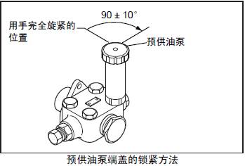 (3) 從放氣塞內(nèi)排出的燃油不含有氣泡時(shí)旋緊塞頭,但在旋緊最后的1個(gè)放氣塞前,先將預(yù)供油油泵的端蓋壓下向右旋回至原狀鎖定。