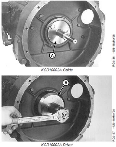1. Position guide (A) from KCD10002A Rear OilSeal/Wear Sleeve Installer Set on crankshaft end withtwo cap screws finger tight.