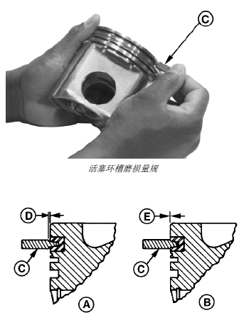 1. 使用合適的活塞環(huán)槽磨損量具 (C) 檢查梯形環(huán)槽(上槽)的磨損程度。在活塞四周多個測量點(diǎn)檢查環(huán)槽。量規(guī)肩部不能與活塞環(huán)口接觸。量規(guī)肩部與活塞環(huán)口有間隙 (D) 表明活塞環(huán)槽狀態(tài)良好。如果活塞環(huán)槽磨損,應(yīng)成套更換活塞和汽缸套。如果活塞環(huán)槽完好,應(yīng)繼續(xù)執(zhí)行下面的步驟。