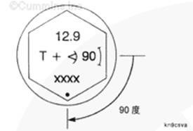 在與螺釘頭部上的小圓點(diǎn)鄰近的缸蓋上做標(biāo)記。此標(biāo)記用來(lái)幫助將螺釘擰緊到要求的角度。
