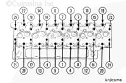 由于缸蓋松弛,重新擰緊短螺釘(1 號(hào)、2 號(hào)、3 號(hào)、6 號(hào)、7 號(hào)、8 號(hào)、9 號(hào)、10 號(hào)、11 號(hào)、14 號(hào)、15 號(hào)、16 號(hào)、17 號(hào)、18 號(hào)、19 號(hào)、22 號(hào)、23 號(hào)、24 號(hào)、25 號(hào)和 26 號(hào)),以符合正確的缸蓋緊固要求。