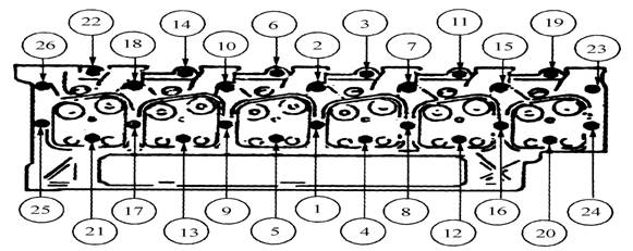①氣缸蓋安裝時,應把標有“缸體側”的一面朝向氣缸體,檢查水、油孔是否對齊。氣缸墊用過1次后不能再用。康明斯B系列發動機氣缸蓋螺栓的擰緊順序如下圖所示。