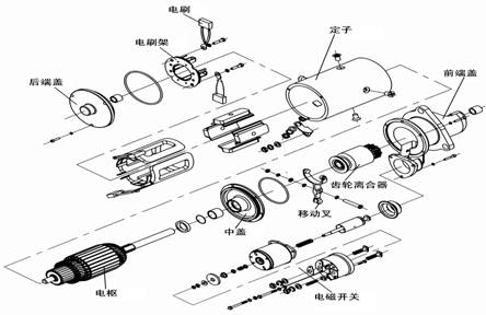 康明斯系列起動機是帶有電磁開關和單向離合器的直流電機,是短時工作制,由蓄電池供給電源,用于起動柴油發動機。起動機結構是雙線制。
