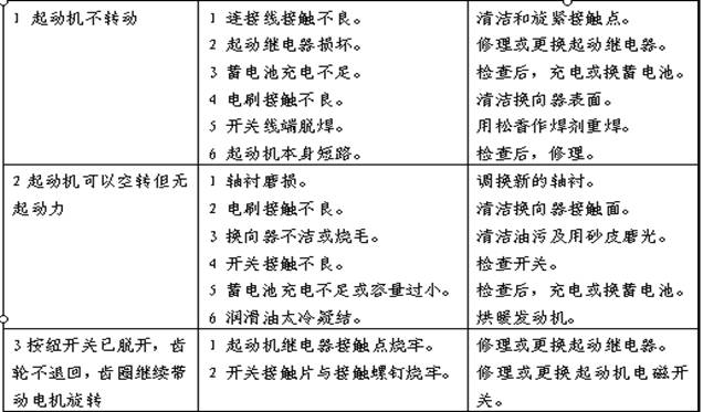 12.在更換起動機前,應先檢查鎖匙開關、中間繼電器、磁力開關是否有燒結現象,如發現有燒結現象,請先更換這些零件后,再更換起動機,以免起動機重復損壞。