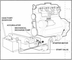 1) 液壓啟動裝置:利用高壓液壓油所釋放的能量啟動發動機,通過發動機驅動的液壓泵或則手動泵來建立高壓。