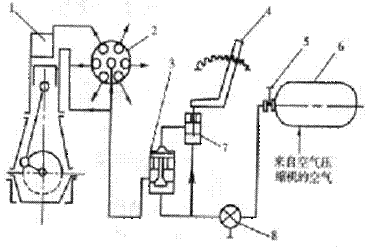 7)  主要部件有:空氣壓縮瓶6、主啟動閥3、空氣分配器2、氣缸啟動閥1和啟動控制閥7。