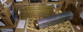 康明斯KTA發動機采用內置式板翼式,置于發動機水道腔體內,直列與V形機型的區別在于:直列機型機油冷卻器芯置于機體側部水道腔體內, V形機型機油冷卻器芯置于V型機體中部水道腔體內。)M11發動機采用整體管束式冷卻器,置于發動機排氣管側。