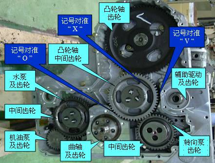 1.正時齒輪系:由曲軸齒輪、凸輪軸齒輪、輔助驅(qū)動齒輪以及中間齒輪等構(gòu)成;由曲軸齒輪將運動傳遞給凸輪軸齒輪、輔助驅(qū)動齒輪,并由正時記號建立相互間的轉(zhuǎn)角關(guān)系,其中心距和齒側(cè)間隙由設計保證,裝配時勿需調(diào)整。