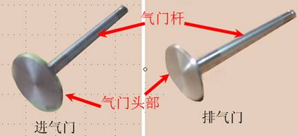 氣門分為進氣門和排氣門,分別控制進氣和排氣,結構相同,進氣門頭比排氣門頭大。氣門由氣門頭和氣門桿兩部分構成。氣門頭為圓盤形,氣門桿為圓柱形。氣門桿的尾部成錐形,用以安裝鎖片。氣門與氣門座共同形成密封面來密封氣缸內氣體。