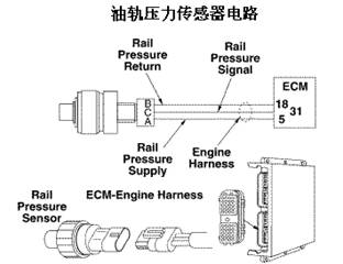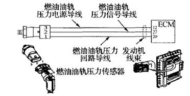 安裝在高壓燃油共軌內(nèi),其功能是:ECM利用該傳感器信號(hào)確定油軌中的燃油壓力,同時(shí)利用它來計(jì)算燃油供油量,工作范圍在0~1500 Ba,。傳感器出現(xiàn)故障將導(dǎo)致發(fā)動(dòng)機(jī)動(dòng)力下降、轉(zhuǎn)速降低甚至停車。