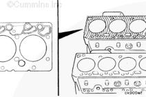 康明斯ISF3.8 CM2220 AN 和 IAN 發動機缸蓋密封墊采用專門的金屬設計,水孔周圍的兩側都有印制的 O 形圈。密封墊上的壓紋密封住了缸孔。密封墊還提供節流作用,控制缸體流至缸蓋的冷卻液流。本手冊涉及的發動機不需要進行缸蓋密封墊分級。對于缸蓋或缸體燃燒表面的重修,可以使用厚度增大的缸蓋密封墊。