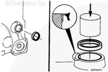 測(cè)量附件驅(qū)動(dòng)油封凸臺(tái)的高度。如果高度為 35 mm [13/8 in],則在安裝油封時(shí)使其與凸臺(tái)平齊。如果高度為 38 mm [1½ in],則在安裝油封時(shí)使其低于凸臺(tái)的頂部 3 mm [1/8 in。用心軸安裝附件驅(qū)動(dòng)油封。