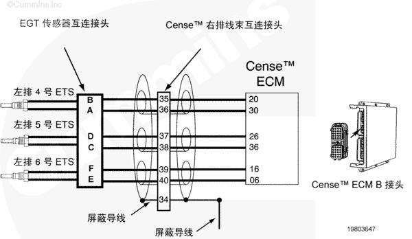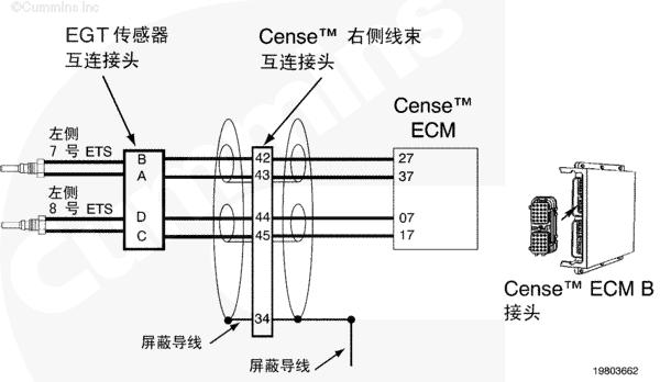 當(dāng)鑰匙處于 ON(接通)或者康明斯發(fā)動機運轉(zhuǎn)時,可以使用 Insite™ 來監(jiān)測排氣溫度傳感器的溫度值以快速檢查電路圖工作情況。有三個傳感器連接到左排線束上的一個接頭。為了進(jìn)行系統(tǒng)快速檢查,從有故障代碼的傳感器上斷開傳感器接頭。INSITE™ 讀取到的所有傳感器溫度,除了 9 號排氣溫度傳感器之外,都應(yīng)為非常低。如果斷開了與 7 號和 8 號排氣溫度傳感器相關(guān)的接頭,則 9 號排氣溫度傳感器讀取到的溫度值會非常高。短接每個傳感器的傳感器觸針“排氣溫度傳感器信號(正極)和排氣溫度傳感器信號(負(fù)極)”。Insite™ 中新的冷連接點處同一接頭上的傳感器的溫度讀數(shù)都將近似相同。這表示線束、熱電偶放大器和 CENSE™ ECM 正常工作,但傳感器有故障。如果接頭、線束、熱電偶放大器或者 CENSE™ ECM 有間歇性、故障或者腐蝕的連接,則有故障代碼的排氣溫度傳感器的溫度值響應(yīng)將不會如上所述。將需要對系統(tǒng)的其余部分進(jìn)行故障診斷以確定有故障的部件。該過程假定同一個傳感器接頭上的所有三個傳感器都沒有故障代碼。