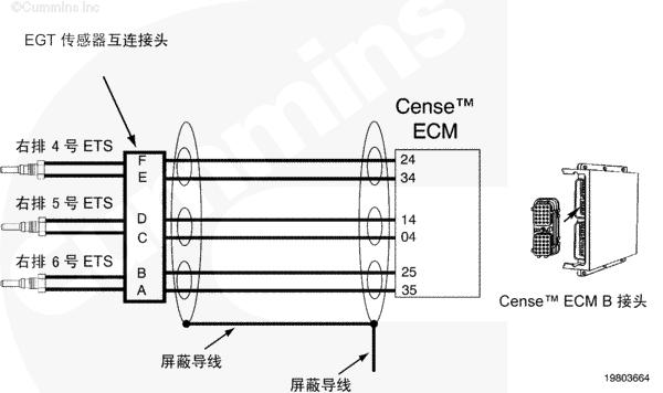 當(dāng)鑰匙處于 ON(接通)或者康明斯發(fā)動(dòng)機(jī)運(yùn)轉(zhuǎn)時(shí),可以使用 Insite™ 來(lái)監(jiān)測(cè)排氣溫度傳感器的溫度值以快速檢查電路圖工作情況。有三個(gè)傳感器連接到右排線束上的一個(gè)接頭。為了進(jìn)行系統(tǒng)快速檢查,從有故障代碼的傳感器上斷開(kāi)傳感器接頭。INSITE™ 讀取到的所有傳感器溫度,除了 9 號(hào)排氣溫度傳感器之外,都應(yīng)為非常低。如果斷開(kāi)了與 7 號(hào)和 8 號(hào)排氣溫度傳感器相關(guān)的接頭,則 9 號(hào)排氣溫度傳感器讀取到的溫度值會(huì)非常高。短接每個(gè)傳感器的傳感器觸針“排氣溫度傳感器信號(hào)(正極)和排氣溫度傳感器信號(hào)(負(fù)極)”。Insite™ 中新的冷連接點(diǎn)處同一接頭上的傳感器的溫度讀數(shù)都將近似相同。這表示線束、熱電偶放大器和 CENSE™ ECM 正常工作,但傳感器有故障。如果接頭、線束、熱電偶放大器或者 CENSE™ ECM 有間歇性、故障或者腐蝕的連接,則有故障代碼的排氣溫度傳感器的溫度值響應(yīng)將不會(huì)如上所述。將需要對(duì)系統(tǒng)的其余部分進(jìn)行故障診斷以確定有故障的部件。該過(guò)程假定同一個(gè)傳感器