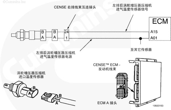 左排后渦輪增壓器壓縮機(jī)進(jìn)口溫度傳感器向 CENSE™ ECM 提供左排后渦輪增壓器壓縮機(jī)進(jìn)口溫度信號(hào)。傳感器的電阻值隨溫度變化。CENSE™ ECM 通過(guò)監(jiān)測(cè)與傳感器串連的內(nèi)部電阻器兩端的電壓檢測(cè)傳感器電阻的變化。內(nèi)部電阻器兩端電壓的變化被轉(zhuǎn)換成溫度的變化。