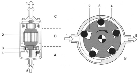 A圖 A 油泵元件 B 電動機 C 后蓋 1-壓力端 2-電動機樞軸 3-滾子泵 4-限壓閥 5-進油端