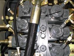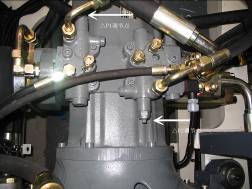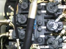 斷開回轉馬達制動油口,如下圖。在斷開的油管上接一測口,在斷開的馬達接頭處接堵頭。