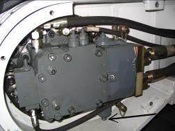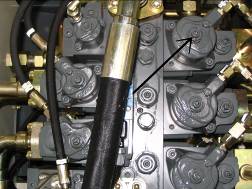 按下控制屏上“F3”鍵,快速回收鏟斗,讀出回油壓力,應為90--100 bar,如果達不到,就調工作閥塊第二個黑六角螺釘,如下圖。