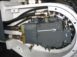 按下控制屏上“F3”鍵,測試儀P1口接梭閥測口,左手快速撥回轉手柄,測回轉安全壓力,應為240 bar,若不是則調回轉馬達上的TC閥調節螺釘。