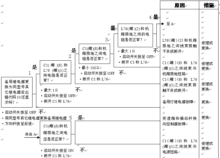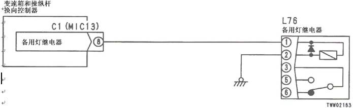 1)備用燈繼電器故障 2)變速箱和操縱桿控制器C1(雌)(8)L76(1)之間線束與電源短路,與機箱接地短路,觸點有故障或斷開 3)后燈繼電器L76(雌)(2)和機箱接地之間線束觸點有故障或斷開 4)變速箱和操縱桿控制器有故障 | ||||