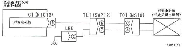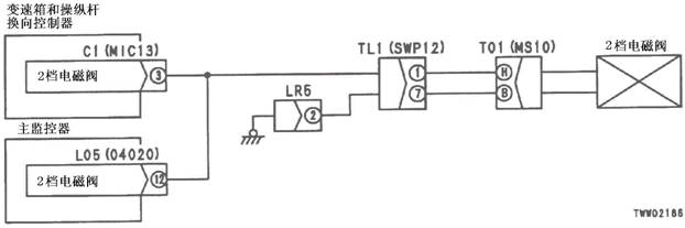 1)2檔R電池閥故障 2)變速箱和操縱桿控制器C1(雌)(10)-TL1(2)-T01(G)之間線束與電源短路,與機箱接地短路,觸點有故障或斷開 3)機箱-TL1(7)-T01(B)之間線束與機箱接地短路,觸點有故障或斷開 4)變速箱和操縱桿控制器有故障 | ||||