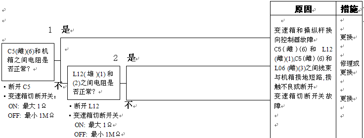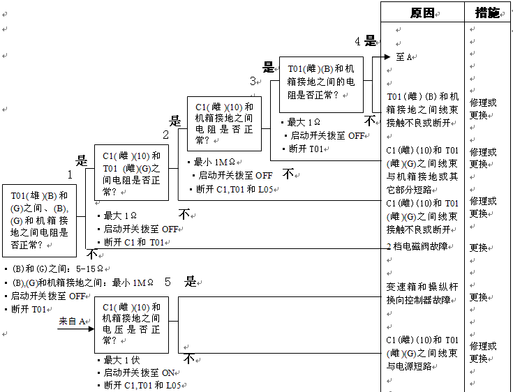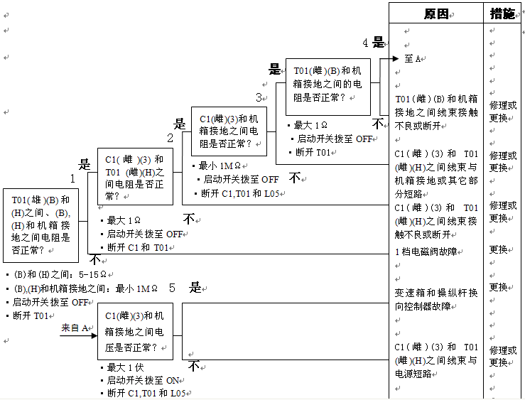 1)3檔電池閥故障 2)變速箱和操縱桿控制器C1(雌)(5)-TL1(3)-T01(F)之間線束與電源短路,與機箱接地短路,觸點有故障或斷開 3)機箱-TL1(7)-T01(B)之間線束與機箱接地短路,觸點有故障或斷開 4)變速箱和操縱桿控制器有故障 | ||||