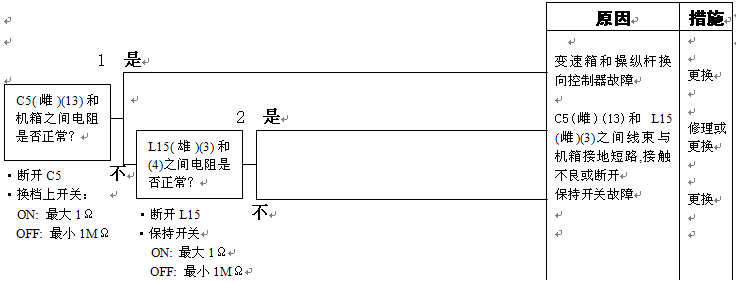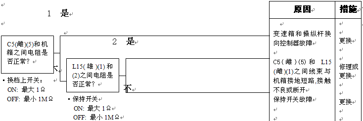 1)變速箱和操縱桿控制器C1(雌)(2)和機箱接地之間的電阻:5-15Ω 2)變速箱和操縱桿控制器C1(2)和機箱接地在空擋時的電壓:小于1伏 |