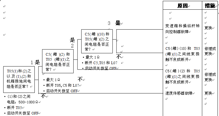 1)速度傳感器故障 2)速度傳感器安裝調整故障 3)變速箱和操縱桿控制器C5(雌)(2)-TL1(11)-T05(1)間線束觸點有故障或斷開 4)變速箱和操縱桿控制器C5(雌)(10)-TL1(12)-T05(2)之間線束觸點有故障或斷開 5)變速箱和操縱桿控制器有故障 |