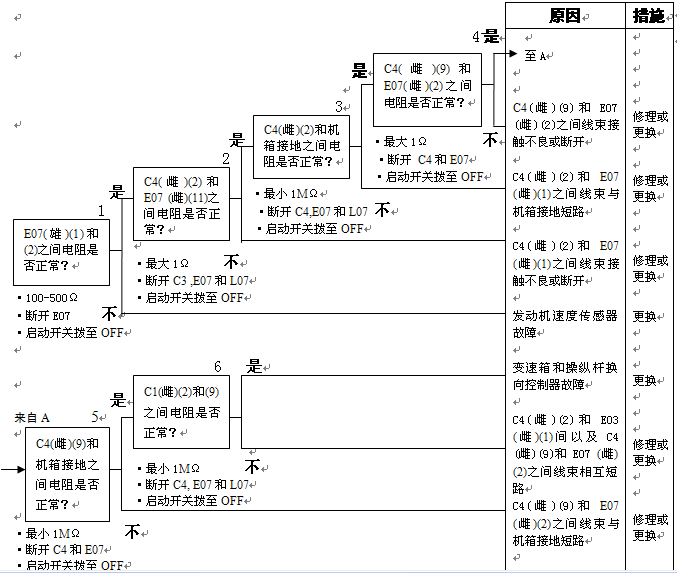 1)發動機速度傳感器E07(1)和(2)之間的電阻:100-500Ω 2)變速箱和操縱桿控制器C4(雌)(2)和(9)之間的電壓 |