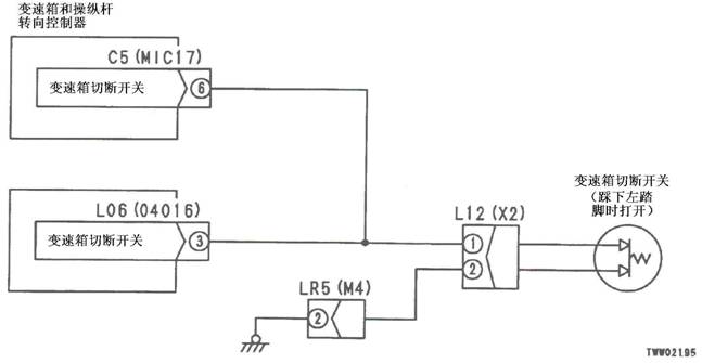 1)方向桿故障 2)組合開關電源故障 以下線束與電源短路,與機箱接地短路,觸點有故障或斷開: 3)變速箱和操縱桿控制器C3B(雌)(5)和L04(2)之間線束 4)變速箱和操縱桿控制器C3B(雌)(13)和L04(3)之間線束 5)變速箱和操縱桿控制器C3B(雌)(6)和L04(4)之間線束 6)變速箱和操縱桿控制器故障 |