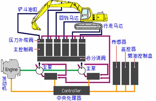 液壓挖掘機(jī)的動(dòng)力裝置是由發(fā)動(dòng)機(jī)、散熱器、連軸器及輔助元件組成。它主要是發(fā)動(dòng)機(jī)和五大系統(tǒng)組成,如下圖所示: