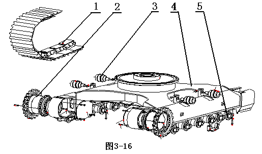 1-履帶;2-行走馬達(dá)及驅(qū)動(dòng)輪;3-托鏈輪;4-X型車架;支重輪