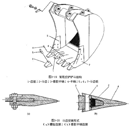 反鏟用的鏟斗形狀、尺寸與其作業(yè)對(duì)象有很大關(guān)系。為了滿足各種挖掘作業(yè)的需要,在同一臺(tái)挖掘機(jī)上可配以多種結(jié)構(gòu)型式的鏟斗,見圖3-19、圖3-20分別為反鏟用鏟斗的基本形式和常用形式。鏟斗的斗齒采用裝配式,其形式有橡膠卡銷式和螺栓連接式,如圖2-5所示。