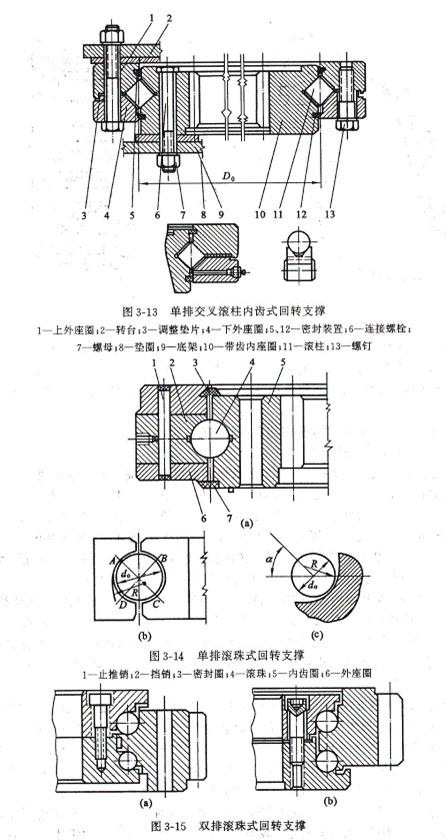 單斗液壓挖掘機(jī)用回轉(zhuǎn)支撐的結(jié)構(gòu)型式,實(shí)現(xiàn)上部平臺(tái)的回轉(zhuǎn),回轉(zhuǎn)支撐按結(jié)構(gòu)形式分為轉(zhuǎn)柱式和滾動(dòng)軸承式等兩種,見圖3-13、圖3-14、圖3-15。