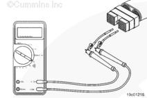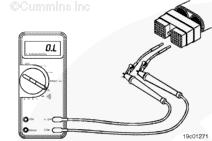 從 ECU 上斷開(kāi) OEM 線(xiàn)束接頭。將測(cè)試導(dǎo)線(xiàn)插入 OEM 線(xiàn)束接頭上的 SAE J1939 數(shù)據(jù)通信接口正極 (+) 觸針,并將其連接到萬(wàn)用表表筆。使萬(wàn)用表的另一根表筆接觸發(fā)動(dòng)機(jī)缸體或底盤(pán)接地。
